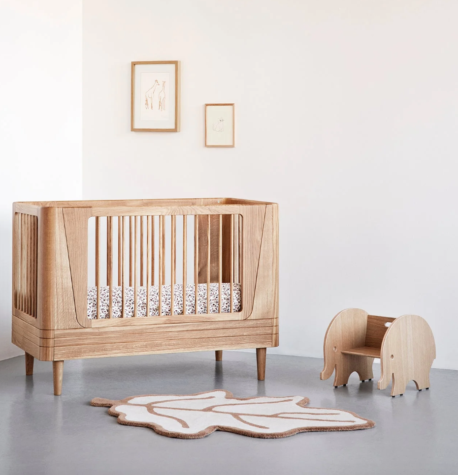 Realizzato in rovere danese massiccio, questo lettino convertibile premium si trasforma da un tranquillo lettino per neonati a un letto junior (con kit opzionale), unendo il calore del legno naturale, una costruzione sicura e uno stile nordico senza tempo per camerette contemporanee.